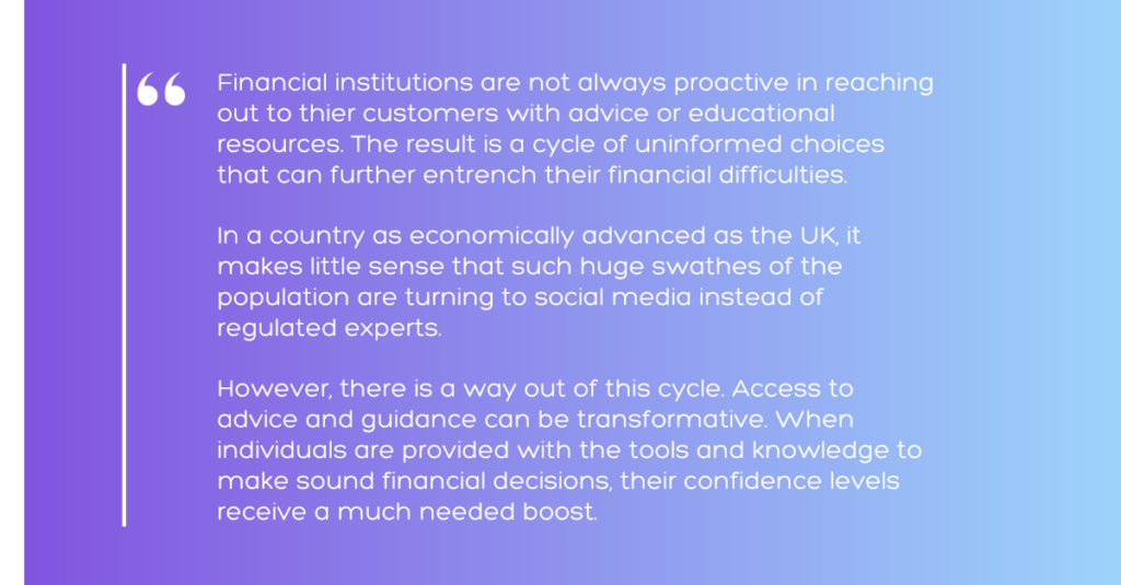 This sounds like an easy win on paper – who wouldn’t want the country’s experts helping them to financial freedom? Well, a lot of people, it turns out. In the digital era, the competition for time, attention, and – most importantly – engagement is fierce. People are increasingly turning to their favourite content creators on TikTok and Instagram for financial advice, highlighting not only our failings in the digital sphere but also the lack of authority and trust a large percentage of people have in their financial institutions.